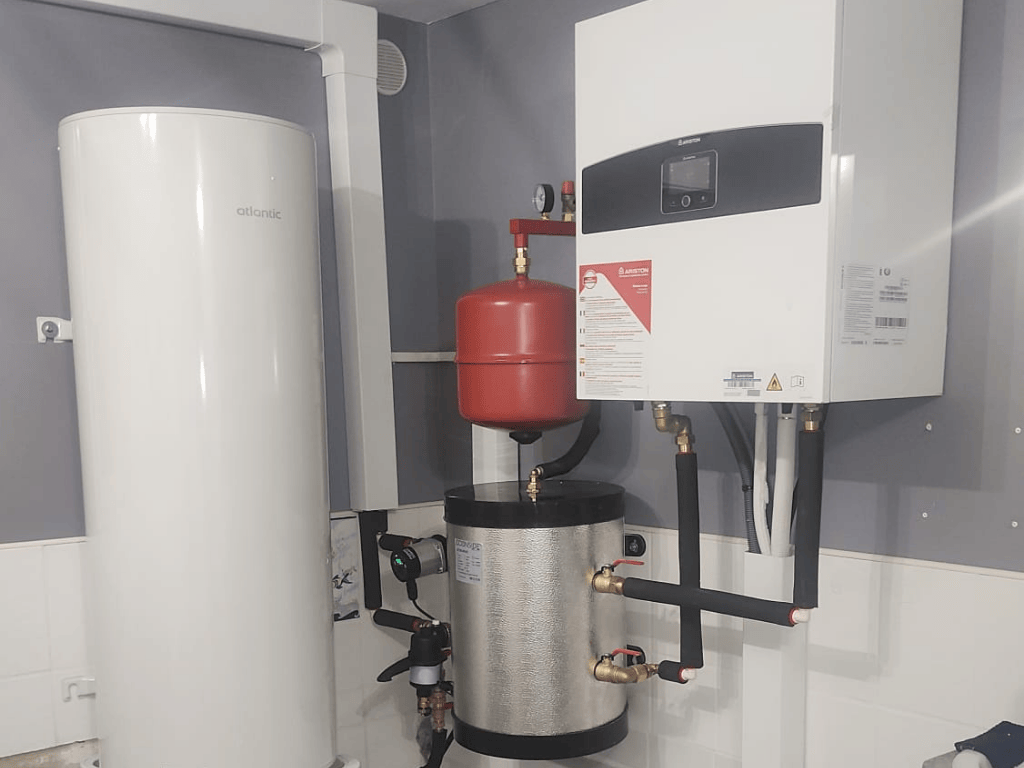 Installation intérieure de pompe à chaleur air/eau avec ballon d’eau chaude et unité murale dans un local technique résidentiel.